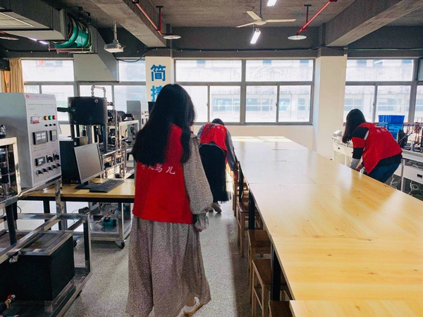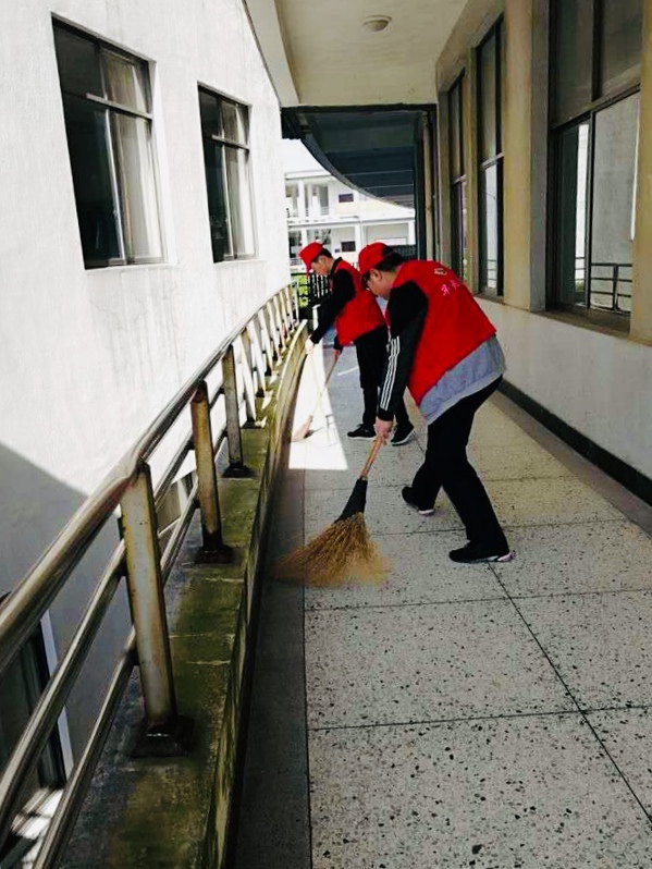 机电党支部学习小组和机制党支部学习小组分别赴东阶梯教室和西阶梯教室,清扫楼道维持教室整洁。
