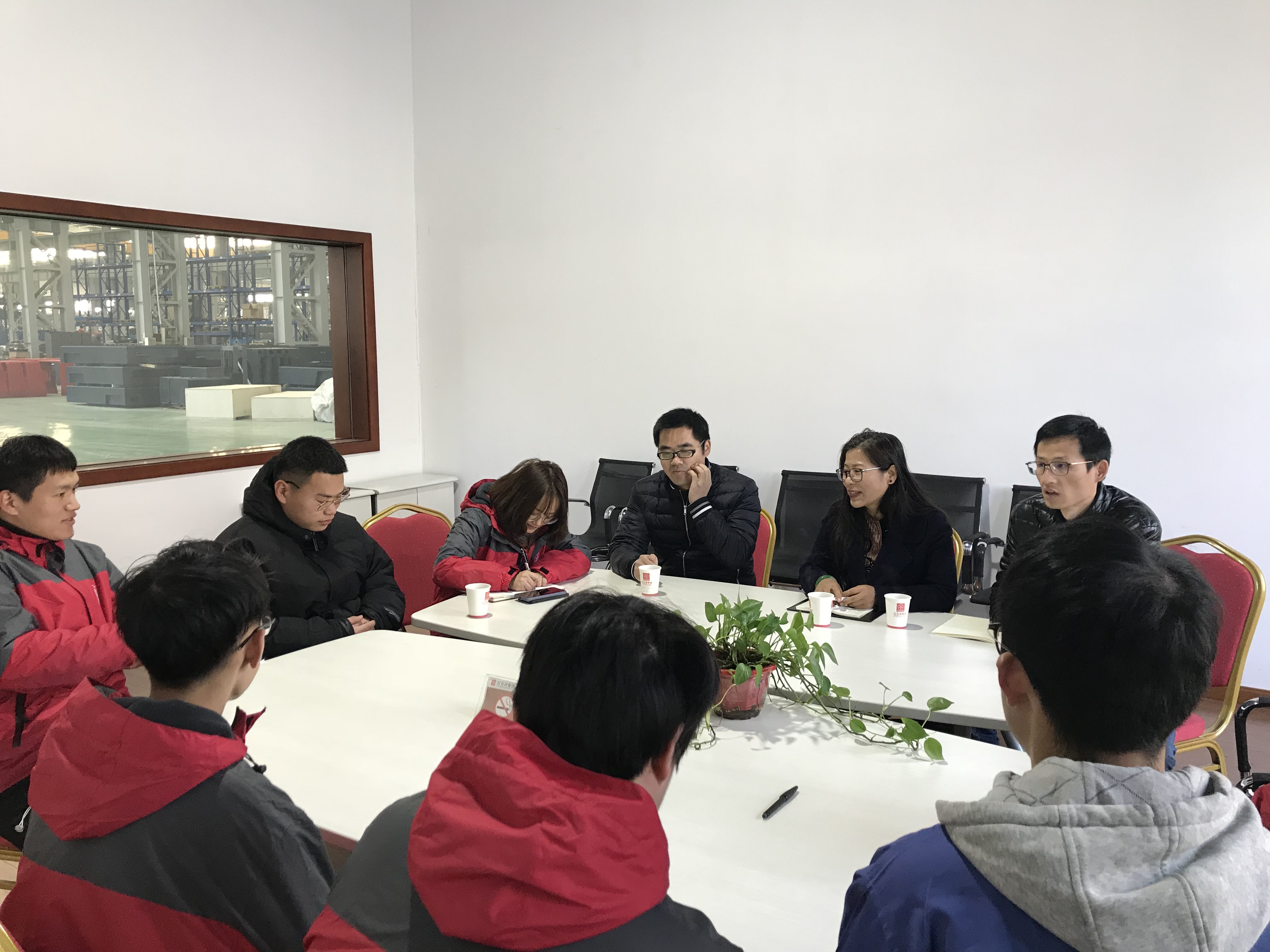 首先,一行人来到红五环集团,在装配车间会议室,7名同学参加了座谈会。张玉贤首先问候大家,她强调“要及时转换角色,从‘员工’转变成‘员工’,遵守企业规章制度,做有责任有担当的新时代员工”。参加座谈的同学纷纷表示“在企业的实际锻炼,很好地将理论应用于实践,企业的师父耐心细致地指导,我们也脚踏实地地肯学,企业精英化培养使得我们快速的成长与提高,企业为我们提供的成长通道十分畅通”。参与座谈的集团人事许经理表示公司员工都很吃苦耐劳,专业知识扎实,与人交往能力突出,感谢公司为集团输入优秀的人才。