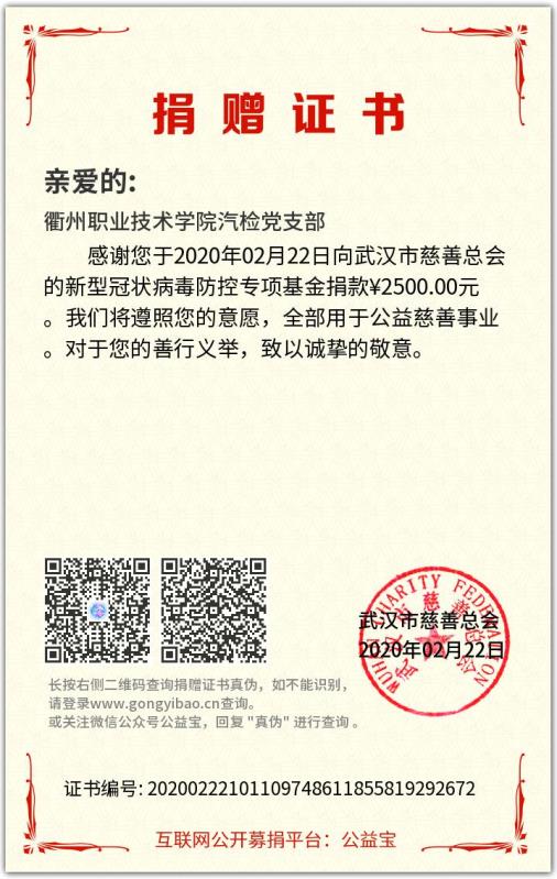 2月21日下午1点,汽检党支部通过微信视频形式举行了主题党日活动。所有党员分享了自己的教学经验。罗方赞使用超星学习通布置视频任务,钉钉班级群播放课程录像和直播作业讲评及课程难点的方式。该模式,可以避免上课初期各班级集中签到产生的网络拥堵,通过作业了解员工的知识掌握情况,并通过直播进行解疑答惑。会议当天,由魏小华同志提出倡议,向灾区人民奉献爱心,党员们纷纷响应,仅用半天时间就收集了善款2500元整,其中员工党员杨金城也捐出200元。善款已捐给武汉市慈善总会。