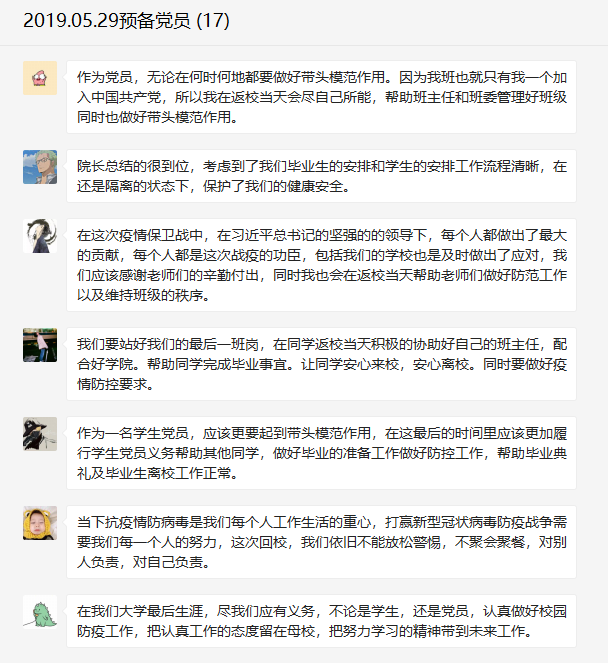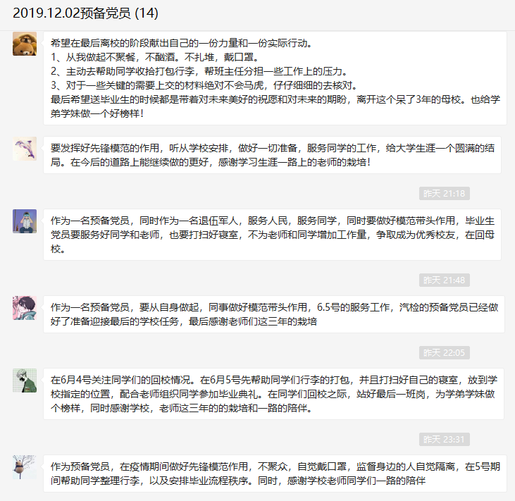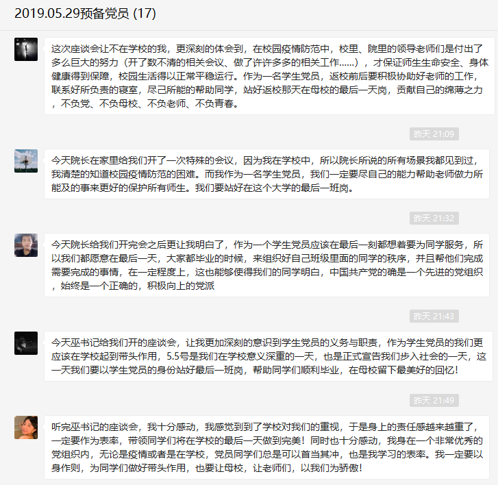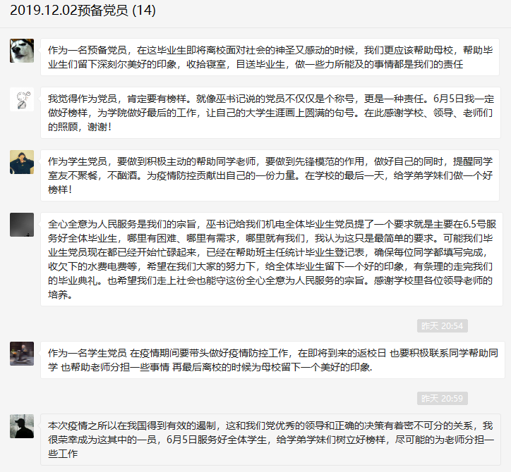 往年,毕业生返校之际,太阳成集团tyc7111cc党总支会在毕业生党员离校前召开员工党员座谈会,做好毕业生党员思想教育工作和安全教育。今年,因为疫情影响,员工们返校时间短,任务重,留给大家坐在一起交流的时间很少。但党员的思想教育不能缺席,为了上好员工离校前最后一次党课,太阳成集团tyc7111cc党总支创新形式,于2020年5月28日晚7点,组织全体毕业生党员,相约云上,举行了一场别开生面的线上座谈会。