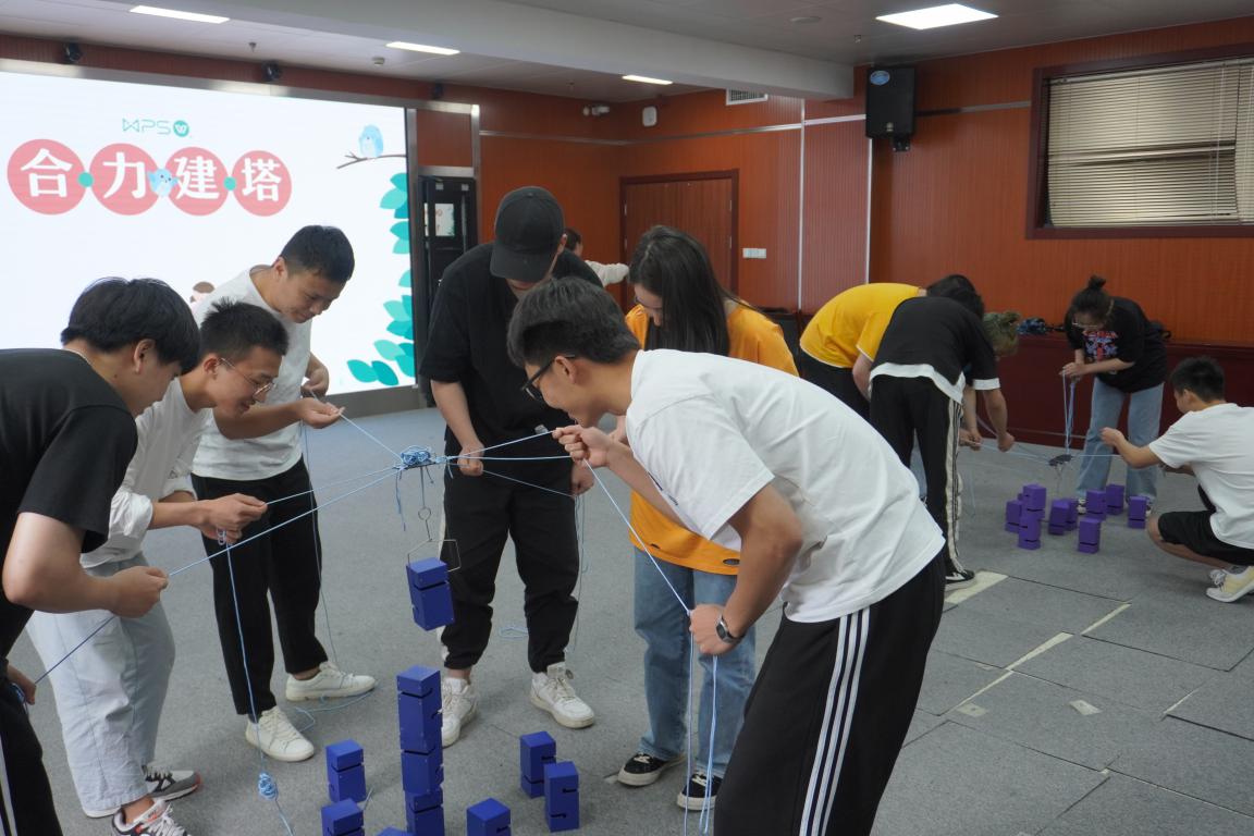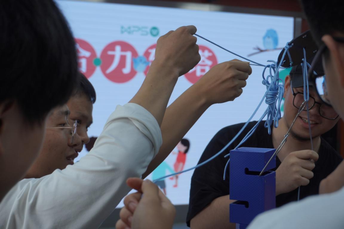 “合力建塔”是一个特别考验团队配合的项目,能锻炼团队的默契度、协作度。经过前期的磨合,各小组组员配合,通过手拉绳子控制吊板,不停的叠加积木,不一会就将塔搭的高高的。