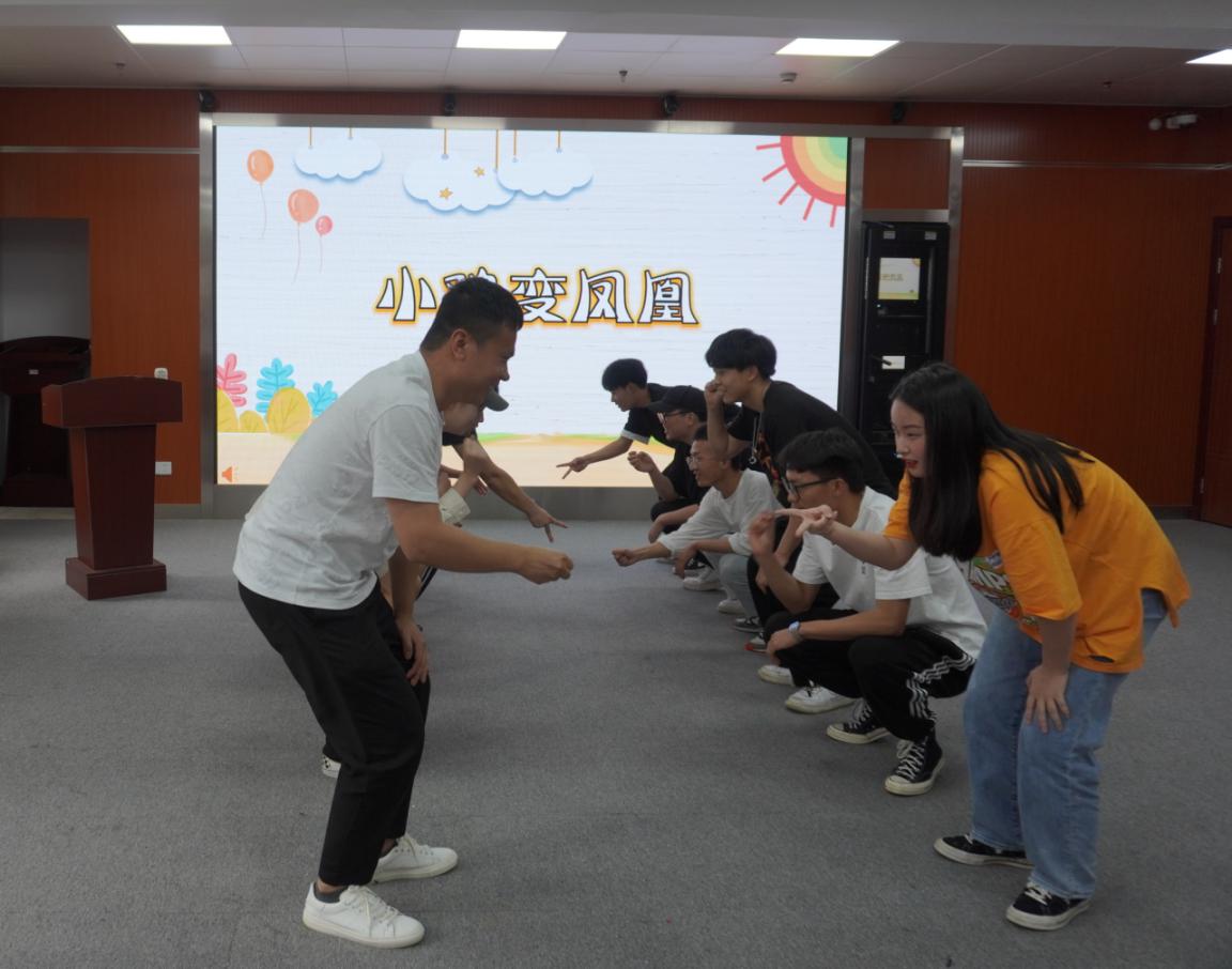 热身活动“小鸡变凤凰”,参与游戏的每个人会有四种身份,分别是鸡蛋、小鸡、大鸡和凤凰。初始大家都是“鸡蛋”,以石头剪子布进行自由pk,赢的同学可以升级。各小组跃跃欲试,游戏开始后现场瞬间沸腾了起来。在这个过程中,同学们玩的不亦乐乎,猜拳声、笑声汇成一团。