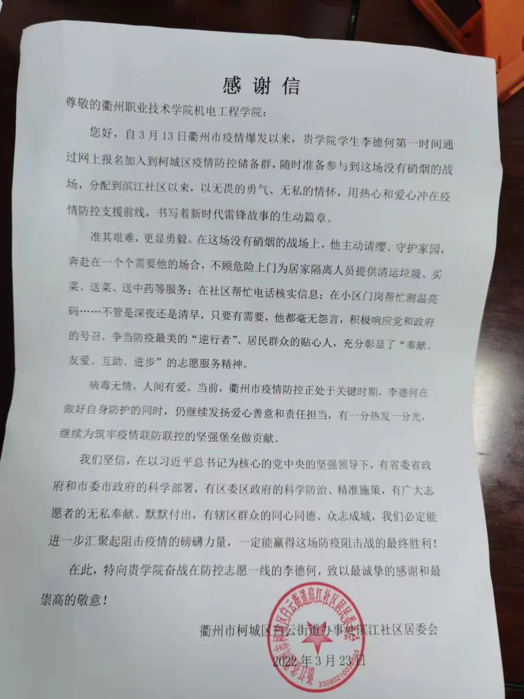 近日,公司太阳成集团tyc7111cc收到了一封感谢信,感谢自 3 月 13 日衢州市疫情暴发以来,太阳成集团tyc7111cc员工李德何第一时间通过网上报名加入到柯城区疫情防控储备群,随时准备参与到这场没有硝烟的战场。自从来到滨江社区,李德何同学以无畏的勇气、无私的情怀,用热心和爱心冲在疫情防控支援前线,书写着新时代雷锋故事的生动篇章。