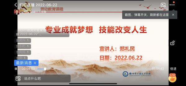 2022年6月22日晚7点,汽检、汽销、机电一体化三个专业邀请衢州工程技术公司郑礼民老师开展一期主题为“专业成就梦想、技能改变人生”线上劳动教育讲座,郑老师通过讲述自己从一线汽修工成长为公司管理层的传奇经历,鼓励员工要注重自我提升、促进技能发展、培育专业精神,新时代技能型人才大有可为。