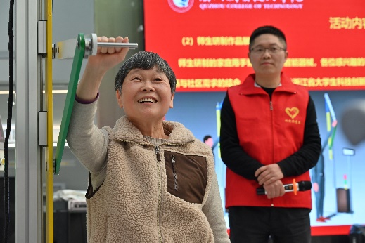 活动第二场,我们向社区居民展示师生研制的家用手臂关节训练智能器械讲解该器械的设计思想和工作原理,让大家更加了解其背后的科学原理。同时,邀请居民亲自体验并感受器械的使用性,让他们亲身感受到这项科技带来的便利与效果。最后,我们期待并欢迎社区居民提出宝贵的改进建议,以便不断改进和完善这一智能器械,更好地服务社区居民的健康和生活需求。