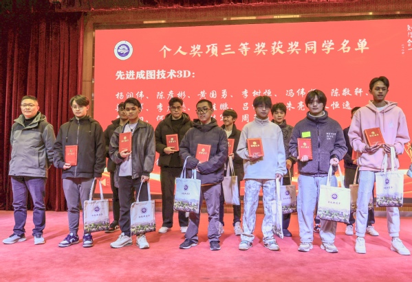 荣获奖项同学以及优秀指导教师依次上台领奖,颁奖嘉宾分别为他们颁发了荣誉证书及奖品,并合影留念。台下掌声雷动,向获奖师生表示热烈祝贺。