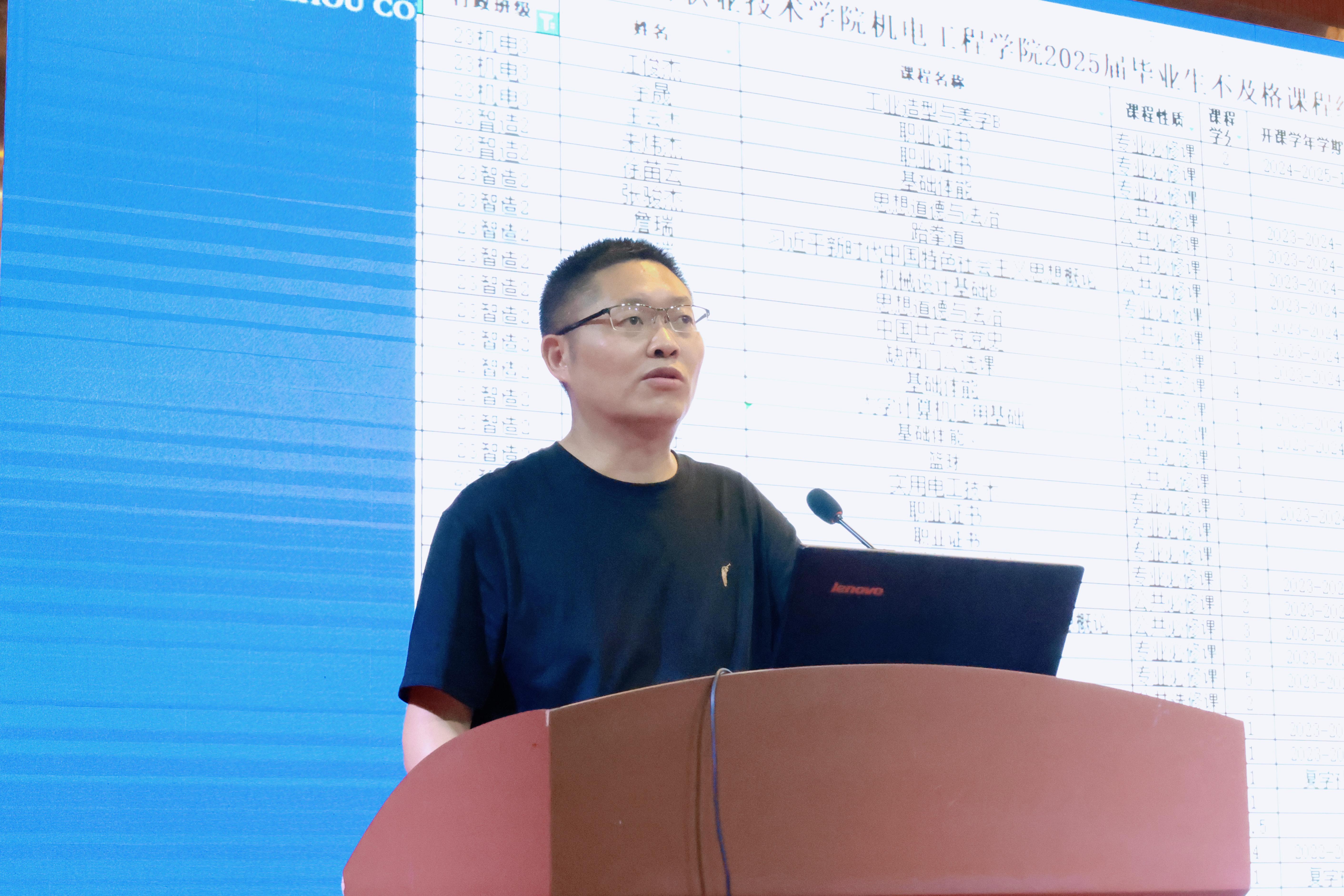 副经理徐文俊通报2025届毕业生学业审核情况,说明毕业生学业情况和事项说明,以及强调职业资格证书是毕业关键环节。此外,徐副经理以学科竞赛获奖案例激励员工主动规划学业,通过参与“互联网+”“机械设计大赛”等相关竞赛提升专业技能,提升自我技术能力范围。