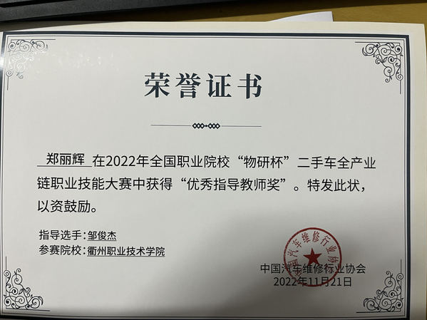 郑丽辉获全国职业院校“物研杯”二手车全产业链职业技能大赛“优秀指导教师”