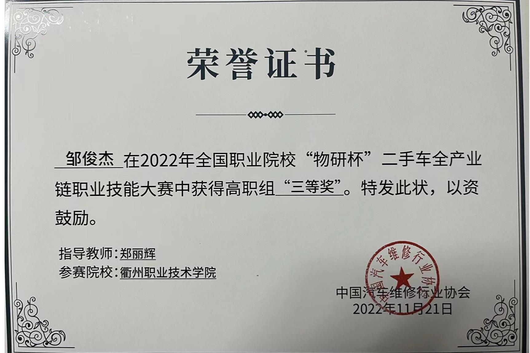 郑丽辉指导员工获全国职业院校“物研杯”二手车全产业链职业技能大赛高职组三等奖