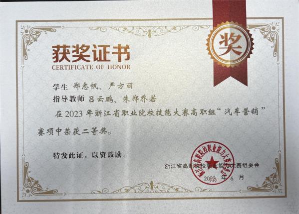 吕云鹏、朱郑乔若指导员工获2023年浙江省职业院校技能大赛高职组“汽车营销”赛项二等奖